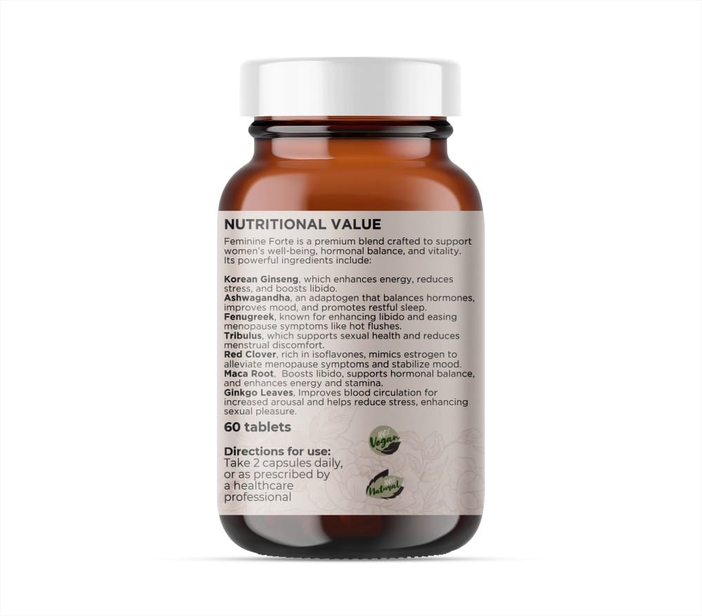 Feminine Forte is a thoughtfully formulated herbal blend designed to support women’s natural vitality, hormonal balance, and libido. Crafted with powerful adaptogens and botanicals, this formula nurtures emotional well-being, balances female hormones, and enhances sexual wellness. Whether you’re navigating stress, hormonal shifts, or simply seeking to restore feminine energy, Feminine Forte offers holistic support to help you feel your best—naturally.
